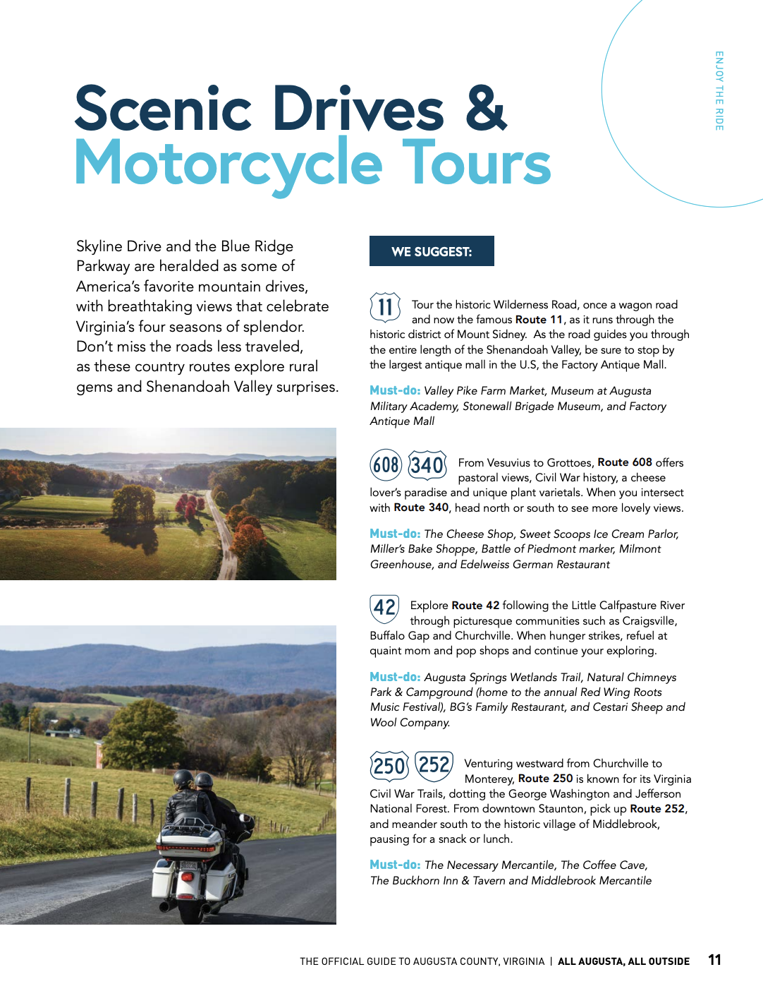 The Official Guide to Augusta County and the online directory are the ultimate resources for visitors and residents looking to explore Augusta County and its surroundings. Whether you’re exploring alone, looking for family fun, or planning a gateway in nature, the guide and directory have suggestions for the best scenic routes, outdoor activities, shopping, local eateries and more. Click the links below for Augusta’s scenic drive tours.
